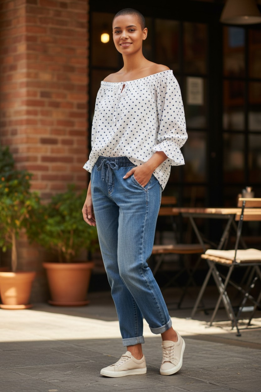 Carmen-Bluse mit Pünktchen weiß
