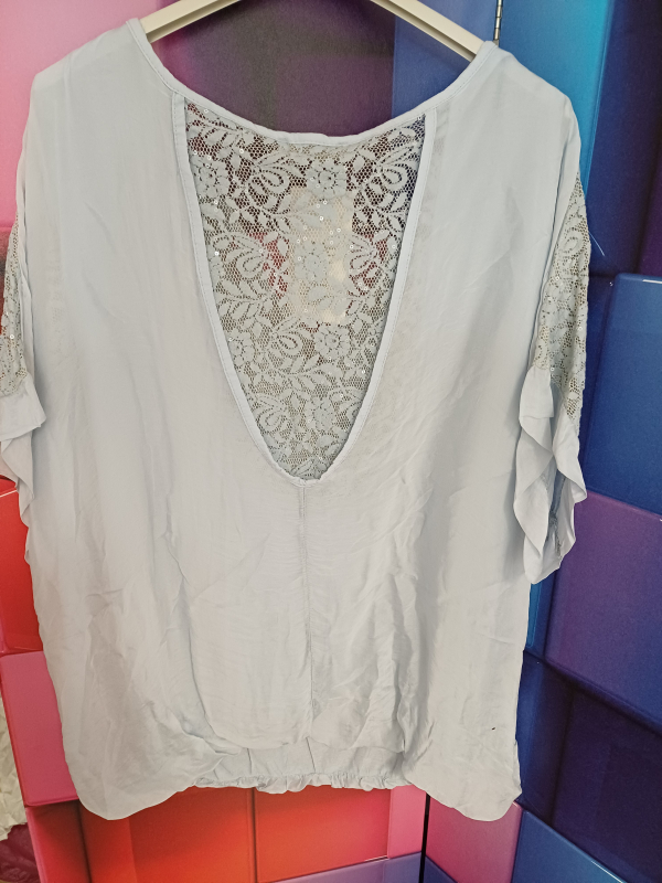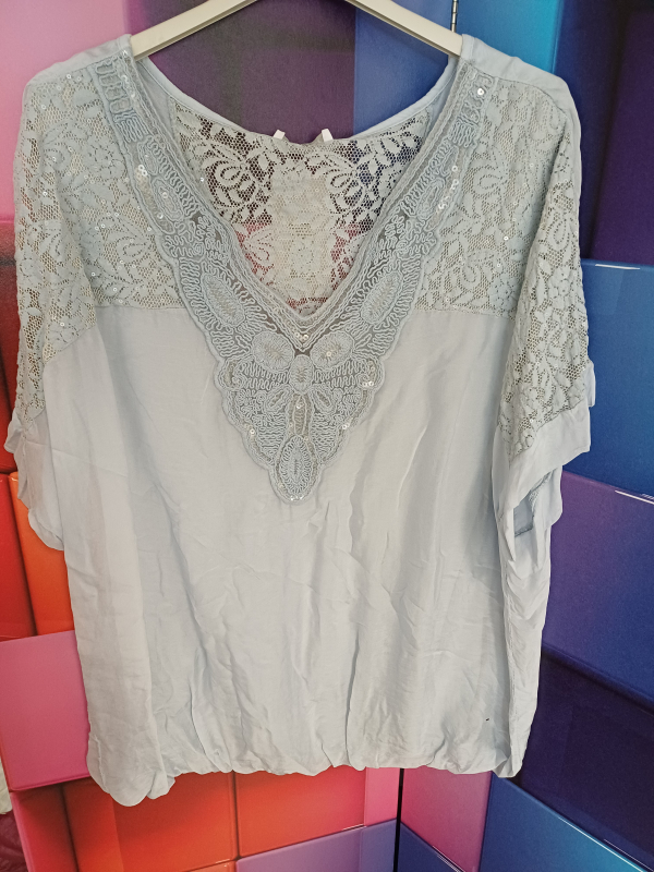 Kurzarm-Bluse Spitze Farbe hellgrau in Einheitsgröße (passt bis Gr. 42/44) Material: 38% Seide, 62% Viscose; 95% Viscose, 5% Elasthan, Länge 68 cm Gummizugbund, Spitzeneinsätze mit Pailetten