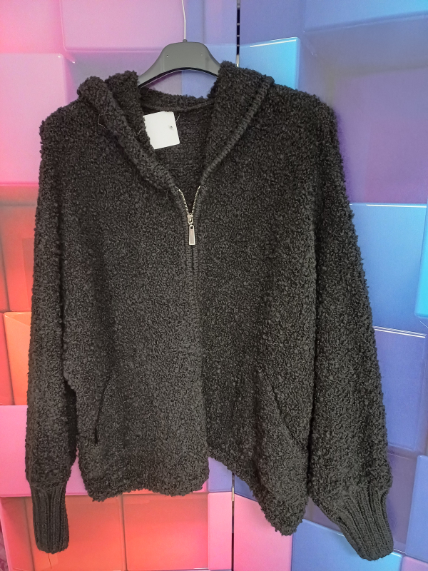 Kuscheljacke mit Kapuze schwarz in Einheitsgröße (passt bis Gr. 42) Material: 62% Acryl, 18% Polyester, 8% Viscose, 8% wolle, 4% Alpaka, Länge 60 cm 2 Taschen, Ärmelbündchen Strick