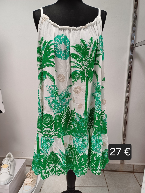 Kleid Dressplaner Spaghettiträger Druck Palmen grün in Einheitsgröße (passt bis Gr. 42) Material:95% Baumwolle, 5% Elasthan, Länge 89 cm luftiges Kleidchen, kleine Falbel als Abschluß