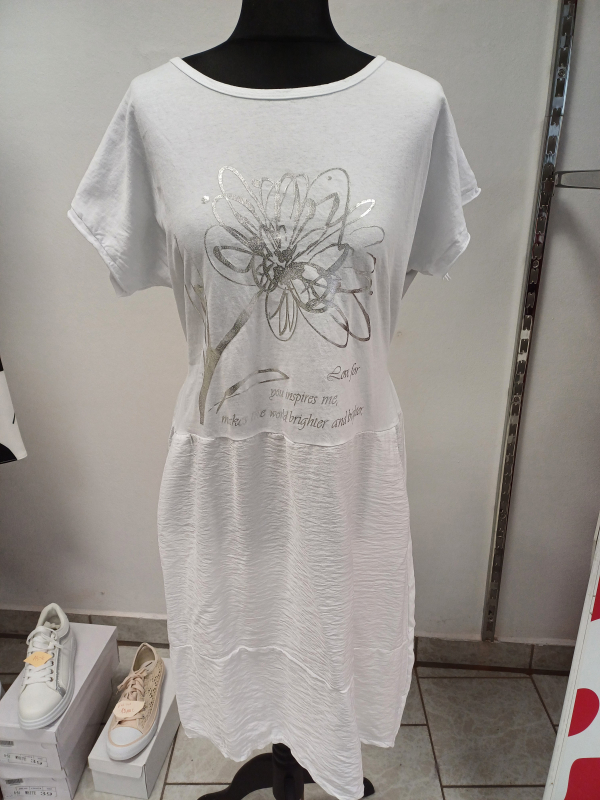 Kleid Kurzarm weiß Druck Blume silber in Einheitsgröße (passt bis Gr. 42/44)