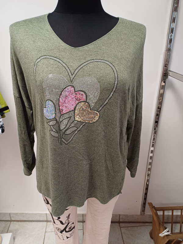 Langarmpullover Dressplaner olivgrün Druck Herzen bunt in Einheitsgröße (passt bis Gr. 42/44)