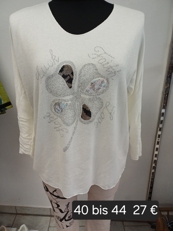 Langarmshirt wollweiß Glitzerdruck Kleeblatt in Einheitsgröße (passt Größe 40 bis 46)