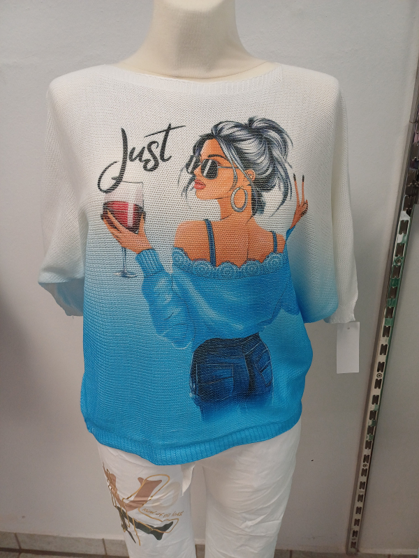 Strickpullover 3/4 Arm natur/blau Druck "Just" in Einheitsgröße (passt bis Größe 42/44)